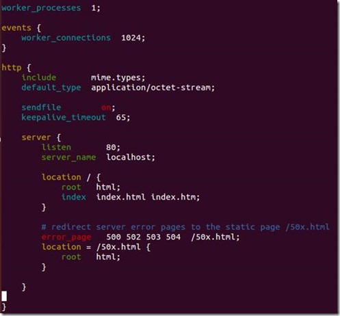 nginx.conf 是主配置文件,默认配置去掉注释之后的内容如下图所示: